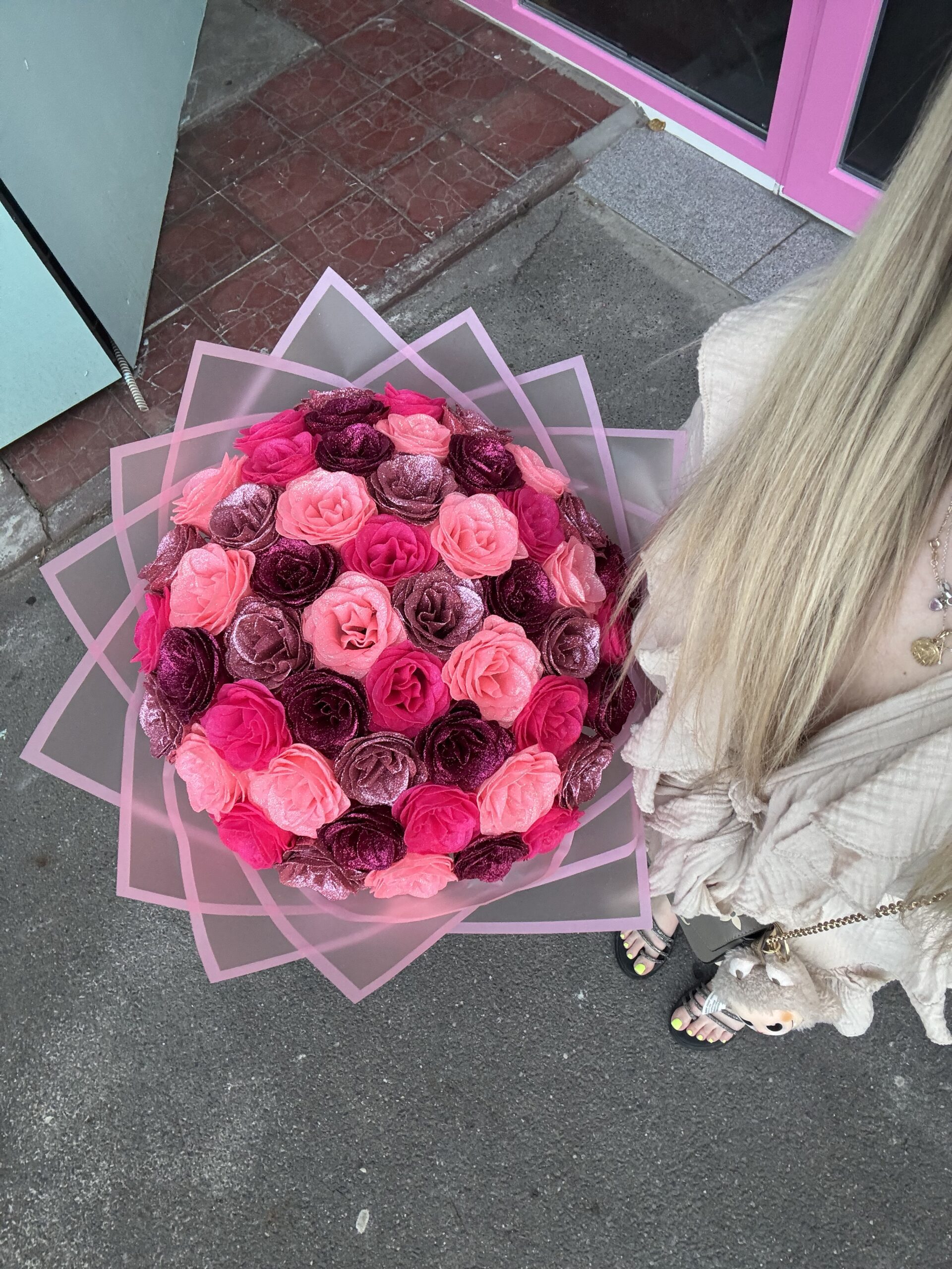 Dacă ești în căutarea unui cadou care să iasă din tipare, acest aranjament cu trandafiri roz și sclipici este alegerea perfectă. Am combinat delicatețea nuanțelor de roz (de la roz pal la magenta) cu un strat fin de glitter pentru a crea un efect vizual de tip „bijuterie”.